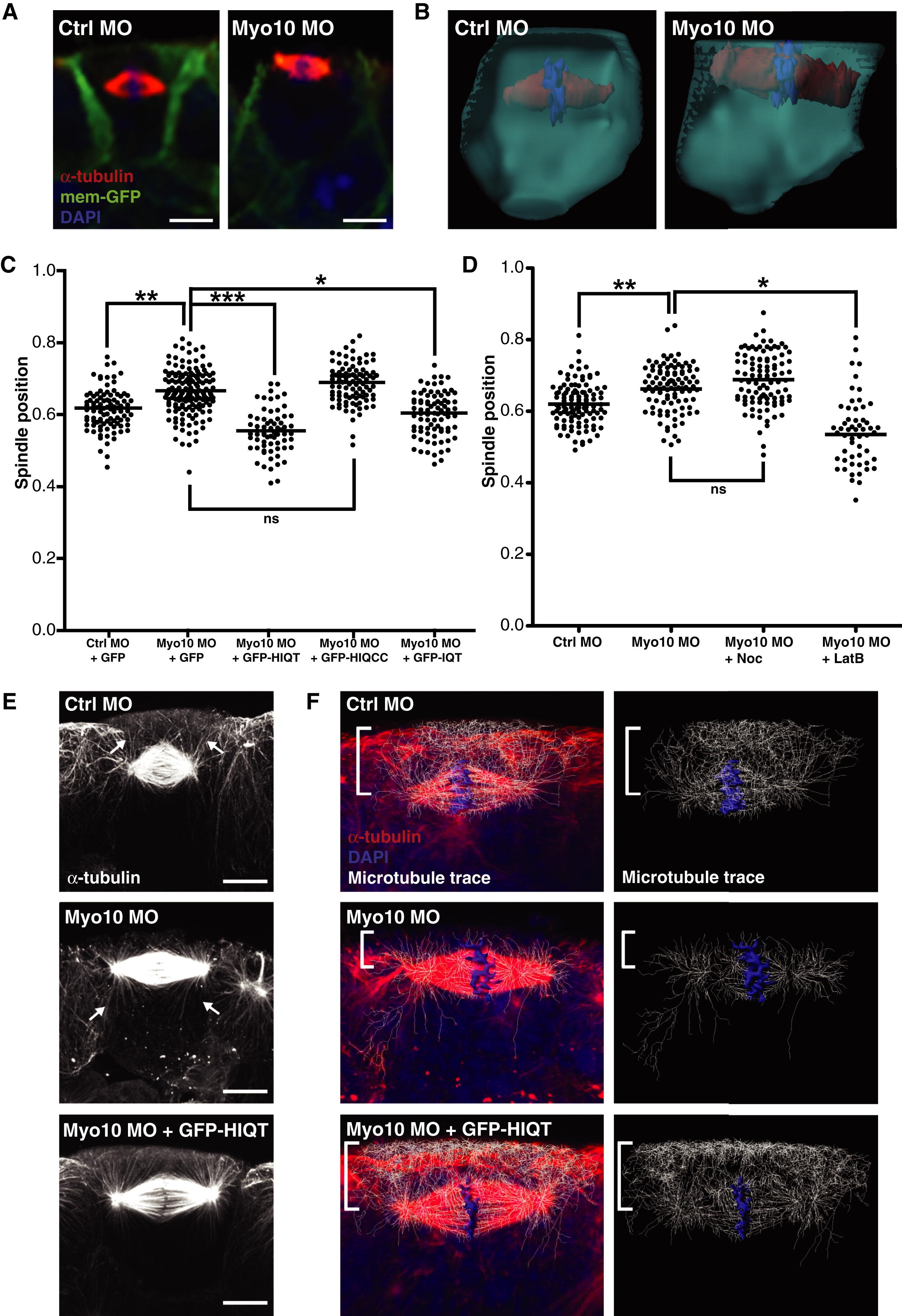 Figure 5. Myo10 Helps Position the Spindle but Functions Antagonistically to F-Actin(A) Side-view immunofluorescent images of spindles in control morpholino (Ctrl MO) and Myo10 MO-injected embryos.(B) 3D reconstructions of single cells from epithelium of Ctrl MO and Myo10 MO embryos.(C) Quantification of spindle position in Ctrl MO, Myo10 MO (both coinjected with GFP as a control), and Myo10 MO rescued with full-length GFP-tagged Myo10 (GFP-HIQT), tailless Myo10 (GFP-HIQCC), or headless Myo10 (GFP-IQT). Spindles are repositioned closer to the apical cell surface in Myo10 MO embryos compared to Ctrl MO, a phenotype rescued by coinjection with full-length or headless Myo10, but not tailless Myo10. To test for significance, unpaired Student's t tests were performed (n = 5 independent experiments for Ctrl MO + GFP and Myo10 MO + GFP, from a total of 27 and 32 embryos, respectively; n = 3 independent experiments, from a total of 18 embryos each for Myo10 MO + GFP-HIQT, + GFP-HIQCC, and + GFP-IQT; âp < 0.05, ââp < 0.01, âââp < 0.01).(D) Quantification of spindle position in Ctrl MO, Myo10 MO (both treated with 0.1% DMSO as a control), and Myo10 embryos treated with Noc or LatB. Treatment with low-dose Noc does not affect Myo10 MO spindle position, but LatB treatment of Myo10 MO embryos causes spindles, on average, to move basally and results in a wider spread of spindle position. To test for significance, unpaired Student's t tests were performed (n = 3 independent experiments, from a total of 20, 16, 18, and 11 embryos for Ctrl MO, Myo10 MO, Myo10 MO + Noc, and Myo10 MO + LatB, respectively; âp < 0.05, ââp < 0.01).(E) High-resolution side-view confocal images (stacks of 13 z slices for each condition) of spindle microtubules in Ctrl MO, Myo10 MO, and Myo10 MO rescued with GFP-HIQT. In Ctrl MO cells, spindle microtubules have an apical asymmetry, with more astral microtubules on the apical side (arrows). Spindles in Myo10 MO cells lose this asymmetry, and long basal astral microtubules are seen (arrows). The GFP-HIQT rescue restores the apical asymmetry.(F) Filament tracing of the microtubule signal (white trace of red staining) provides an unbiased approach to view the asymmetry of the microtubule network. For each image, the trace represents only microtubules present in the central mitotic cell: any traces originating in neighboring cells were deleted. In particular, a dense network of microtubules is seen on the apical side of Ctrl MO spindles, which is lost in the Myo10 MO and restored in the GFP-HIQT rescue (square bracket).ns, not significant. Scale bars represent 10 μm. See also Figure S3. |