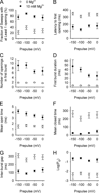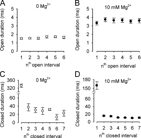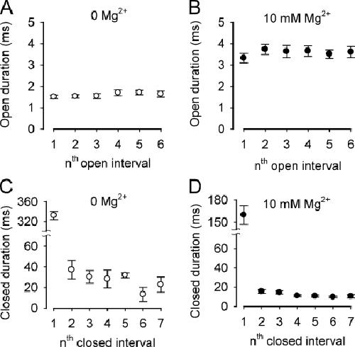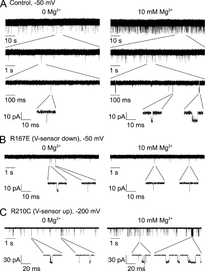 BK channels are activated by intracellular Ca(2+) and Mg(2+) as well as by depolarization. Such activation is possible because each of the four subunits has two high-affinity Ca(2+) sites, one low-affinity Mg(2+) site, and a voltage sensor. This study further investigates the mechanism of Mg(2+) activation by using single-channel recording to determine separately the action of Mg(2+) on the open and closed states of the channel. To limit Mg(2+) action to the Mg(2+) sites, the two high-affinity Ca(2+) sites are disabled by mutation. When the voltage is stepped from negative holding potentials to +100 mV, we find that 10 mM Mg(2+) decreases the mean closed latency to the first channel opening 2.1-fold, decreases the mean closed interval duration 8.7-fold, increases mean burst duration 10.1-fold, increases the number of openings per burst 4.4-fold, and increases mean open interval duration 2.3-fold. Hence, Mg(2+) can bind to closed BK channels, increasing their opening rates, and to open BK channels, decreasing their closing rates. To explore the relationship between Mg(2+) action and voltage sensor activation, we record single-channel activity in macropatches containing hundreds of channels. Open probability (P(o)) is dramatically increased by 10 mM Mg(2+) when voltage sensors are activated with either depolarization or the mutation R210C. The increased P(o) arises from large decreases in mean closed interval durations and moderate increases in mean open interval durations. In contrast, 10 mM Mg(2+) has no detectable effects on P(o) or interval durations when voltage sensors are deactivated with very negative potentials or the mutation R167E. These observations are consistent with a model in which Mg(2+) can bind to and alter the gating of both closed and open states to increase P(o), provided that one or more voltage sensors are activated.