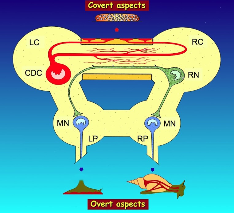 Figure 1. Summarizing scheme of the regulation by the caudodorsal cells (CDC) of Lymnaea stagnalis of overt (visible) and covert (invisible) aspects of egg-laying behavior by, respectively, neurohemal peptide release from axon terminals in the periphery of the cerebral commissure and non-synaptic peptide release from axon collaterals in the inner part of the commissure. Overt aspects include the activation of muscles in the foot for locomotion during substrate cleaning (bottom left) and of muscles attached to the shell for shell turning (bottom right), while covert aspects include the induction of ovulation and the activation of accessory sex glands to produce an egg mass (top). For details on these aspects, see text. LC, left cerebral ganglion; LP, left pedal ganglion; MN, motor neurons; RC, right cerebral ganglion; RN, Ring neuron; RP, right pedal ganglion. |