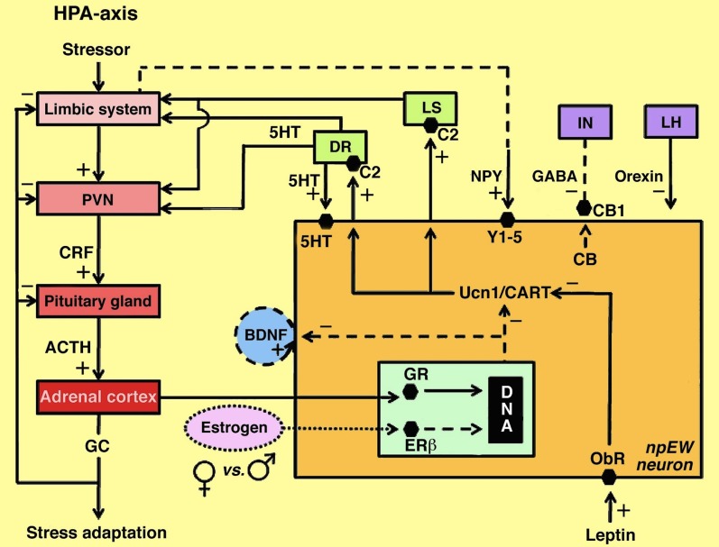 Figure 3. Model of interactions between the npEW and the HPA-axis and other centers involved in stress adaptation and energy metabolism. Continuous lines indicate established interactions, dashed lines indicate presumed interactions; the dotted line refers to sex difference. 5HT, serotonin; ACTH, adrenocorticotrope hormone; BDNF, brain-derived neurotrophic factor; C2, corticotropin-releasing factor receptor 2; CART, cocaine- and amphetamine-regulated transcript peptide; CB, endocannabinoids; CB1, endocannabinoid receptor 1; CRF, corticotropin-releasing factor; DR, dorsal raphe nucleus; ERβ, estrogen receptor β; GABA, γ-aminobutyric acid; GC, glucocorticoids; GR, glucocorticoid receptor; IN, interneuron; LH, lateral hypothalamus; LS, lateral septum; NPY, neuropeptide Y; ObR, leptin receptor; PVN, paraventricular nucleus; Ucn1, urocortin 1; Y-1/5; neuropeptide Y receptors 1 and 5. (Slightly modified after Derks, 2010.) |