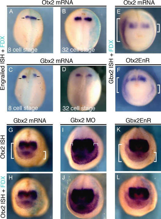 Fig. 3. Otx2 and Gbx2 mutually repress each other in the PPR. (A) and (B) Injection of Otx2 mRNA into the D1 blastomere of 8-cell stage embryos (A) shifts En-1 posteriorly on the injected side (50%. n=28; FDX: turquoise), while injection into the A3 blastomere of a 32-cell stage embryo has little effect ((B); 5% affected, n=36). (C) and (D) Injection of Gbx2 mRNA into the D1 blastomere at 8-cell stage (C) shifts En-1 anteriorly on the injected side (68%; n=64; FDX: turquoise), while injection into the A3 blastomere at 32-cell stage has no effect ((D); 0% affected, n=31). Dorsal view, anterior to the top. (E) and (F) Injection of Otx2 (E; 68% affected, n=31) or Otx2-EnR ((F); 77% affected, n=17) into A3 at the 32-cell stage inhibits Gbx2 in the PPR. Compare bracket in the injected (FDX: turquoise) and uninjected side. (G) and (H) Injection of Gbx2 into A3 at the 32-cell stage leads to Otx2 repression (68%; n=26); compare brackets (G) on the injected ((H): FDX, turquoise) and uninjected side. (I) and (J) Co-injection of splice and translation blocking Gbx2 morpholinos into A3 at 32-cell stage leads to Otx2 expansion (73%; n=33); compare brackets (I) on the injected ((J) FDX, turquoise) and uninjected side. (K) and (L) Injection of Gbx2-EnR into A3 at the 32-cell stage leads to a loss of Otx2 in 62% of embryos (n=52); compare brackets (K) on the injected ((L) FDX, turquoise) and uninjected side. (E)â(L) Frontal view, dorsal to the top. |