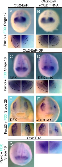 Fig. 6. Activation of Otx2 target genes is required at early and late stages of lens placode formation. (A), (B) Otx2-EnR inhibits Pax6 in the lens at stage 17 (50%, n=26). This is rescued by co-injection of Otx2 ((B); inhibition reduced to 15%, n=20). (C)â(F) Activation of Otx2-EnR-GR at stage 10 reduces lens-specific Pax6 at stage 18 ((D) 52%, n=25); without DEX Pax6 expression is normal ((C) 0% affected, n=23). FoxE3 at stage 25 is normal without DEX ((E) 0% affected, n=30), while addition of DEX at stage 18 leads to reduction ((F) 64%, n=22). (G) Otx2-E1A activates Otx2 targets but does not affect lens Pax6 (0% affected, n=25). All embryos were injected into the A3 blastomere at the 32-cell stage and are shown in frontal view with dorsal to the top. High magnifications of the lens region are shown below each panel; dotted lines demarcate placodal Pax6. Turquoise staining reveals the lineage tracer FDX. |