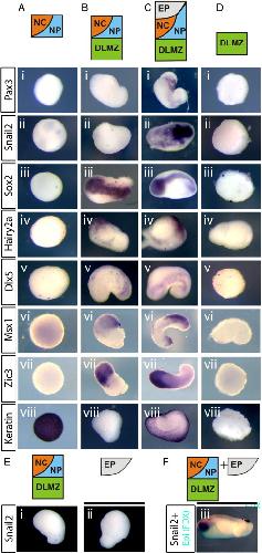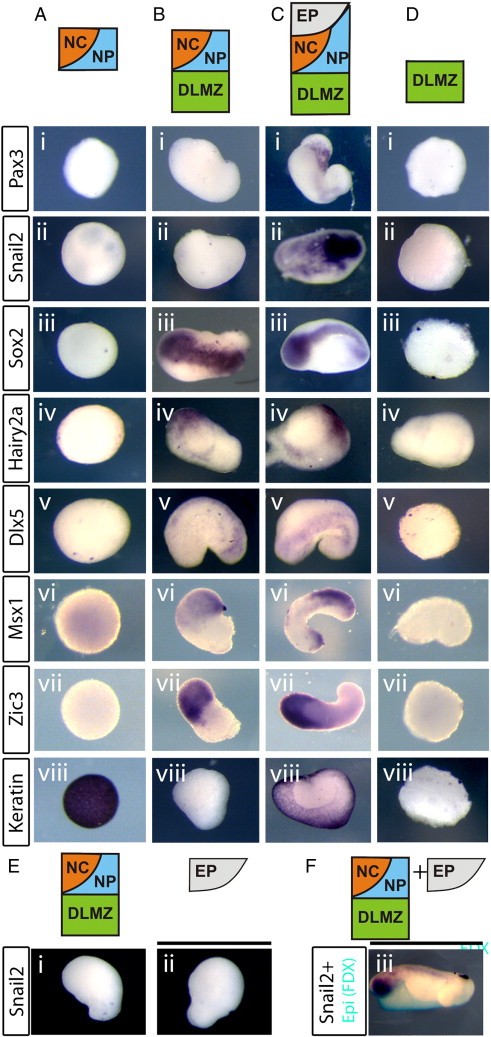 Fig. 1. The DLMZ is able to promote expression of neural plate border (NPB) makers in absence of neural crest (NC). Explants of different sizes were taken at stage 10 then cultured for 30 h. A. Prospective neural crest/neural plate (NC/NP) tissue alone, together with dorso-lateral marginal zone (DLMZ; B) or with DLMZ and epidermis (EP; C). D. DLMZ alone. Markers examined: the neural crest markers Pax3 (i)and Snail2 (ii), the neural plate marker Sox2 (iii), the neural plate border markers Hairy2a (iv), Dlx5 (v), Msx1 (vi) and Zic3 (vii). Also the epidermal marker Keratin (viii). When NC/NP is taken alone, only epidermis is formed (A). In NC/NP/DLMZ explants: only NP and NPB markers are expressed (Biiiâviii), but not Pax3 (Bi) or Snail2 (Bii). With the addition of the epidermis (EP), all markers are present (C). None of the ectodermal markers tested are expressed in the DLMZ alone (D). E. Explants of NC/NP/DLMZ and FDX-labelled epidermis (EP) were cultured for 30 h either separately or as conjugates. As expected, no Snail2 expression is observed either in the NC/NP/DLMZ explants (Ei; 0/15) or in the epidermis explants (Eii; 0/15) when cultured alone. However Snail2 expression (purple) is seen in conjugates (Eiii; 12/15). Epidermis has been stained cyan for FDX label, note that Snail2 is induced within NC/NP/DLMZ and not in the epidermal region (Eiii). |
