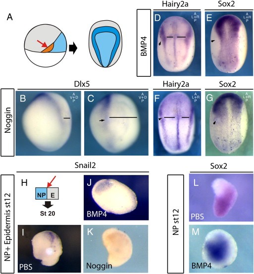 Fig. 4. The neural plate (NP) and neural plate border (NPB) respond to BMP signals in successive time windows. A. Experimental design; Embryos were manipulated (red arrow) at the beginning of gastrulation and the affect on neural plate border (hairy2a/dlx5) and neural plate (sox2) markers was assessed. BâC. A bead soaked in Noggin results in lateral shift of Dlx5 (C) compared to control side (B) when fixed at stage 12. DâE. A bead soaked in BMP4 leads to a shift of Hairy2a towards the midline (D; 71%, n = 17) with a corresponding reduction in the Sox2 expression (E; K; 81%, n = 11). FâG. A bead soaked in Noggin leads to a lateral shift in Hairy2a but without affecting the thickness of the NPB (F; 69%, n = 13) (F) expression with a corresponding expansion of Sox2 (G; 65%, n = 32 G). HâK. Stage 12 explants of both NP and epidermis (EP) were taken, conjugated and cultured until sibling embryos were at stage 20. I. When co-cultured with a PBS bead, Snail2 expression is induced (70% of cases, n = 20). This is inhibited when co-cultures with either a BMP4 (J; 0% with expression, n = 15) or Noggin (K; 20% with expression, n = 10) soaked bead. LâM stage 12 explants continue to express Sox2 in the presence of either a PBS (L; 100% of cases, n = 7) or BMP4 (M; 100% of cases, n = 8) soaked bead. Black lines indicate distances from midline to the NPB. Black arrowheads indicate position of bead. |