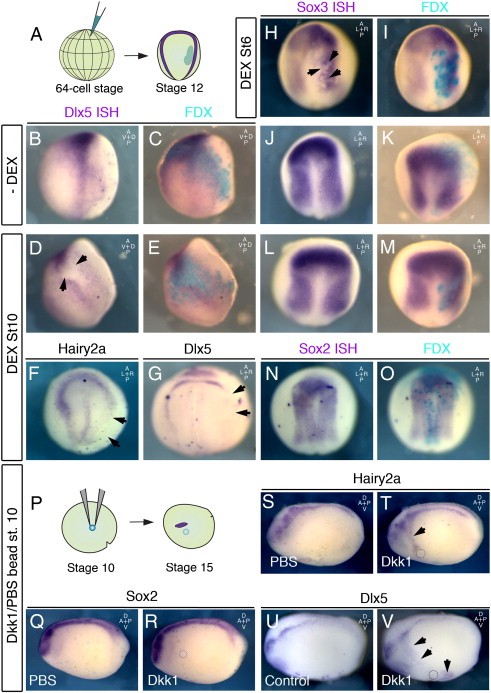 Fig. 5. The neural plate (NP) and neural plate border (NPB) respond to Wnt signals in successive time windows. AâM. Embryos were injected at the 64-cell stage with the inducible beta-catenin contruct β-cateninGR and fixed at stage 12 to determine the specific affect on either NP or NPB markers. BâC. No affect on Dlx5 is seen in the absence of dexamethasone (0% of embryos, n = 9). DâE. Dlx5 is inhibited within injected cells when the construct is activated at stage 10 (70% with inhibition, n = 10). HâI. Inhibition of Sox2 is observed within injected cells when the construct is activated immediately after injection (75% of embryos with inhibition, n = 16). JâK. Little affect is observed upon Sox3 activation at stage 10 (14% of embryos with slight inhibition, n = 14). LâM. No affect is observed in the absence of dexamethasone 0% of embryos affected, n = 22). FâO. Injection of β-cateninGR at the 32-cell stages leads to a loss of both Hairy2a (F; 50% of embryos affected, n = 8) and Dlx5 (G; 65%, n = 23) at stage 15. No affect was observed in the absence of dexamethasone (data not shown, 0%, n = 24). No inhibition of Sox2 was observed either in the presence (G; 0%, n = 38) or absence (data not shown, 0% n = 36) or dexamethasone. PâV. Dkk1/PBS or PBS soaked beads were grafted next to the prospective neural crest at stage 10 and embryos were fixed at stage 15. No expansion of the neural plate was detected either with PBS beads (Q; 0%, n = 24) or with Dkk1 (R; 0%, n = 12). No effect was observed with BSA soaked beads on Hairy2a (S; 0%, n = 26), an expansion was observed with Dkk1 (T; 63%, n = 36). An expansion of Dlx5 was also observed with Dkk1 beads (V; 75% of cases, n = 8) compared to control side (U). Black arrows indicate areas affected, black circles indicate position of grafted bead |