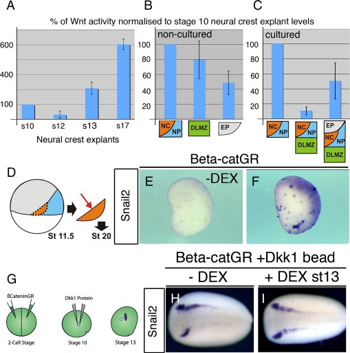 Fig. 6. A dynamic modulation of Wnt levels accompanies the transition from neural plate border to neural crest specification. A, B. Measurements of canonical Wnt activity were measured using a TOPflash luciferase reporter assay. Measurements normalised both protein concentration to control for differences in explant size and displayed as a percentage of stage 10 prospective neural crest (NC) activity. Measurements of Wnt activity made from NC explants at different stages (A) or in explants of NC, DLMZ or EP and measured immediately (B). C. Measurements of cultured explants of NC/NP together with either the dorso-lateral marginal zone (DLMZ) or the DLMZ together with epidermis. DâF. Explants of st11.5 prospective NC were taken from embryos previously injected with a dexamethosone (DEX) inducible beta-catenin construct. No Snail2 expression seen the absence of DEX (0% of cases, n = 21; E), though is expressed upon DEX addition (75% of cases, n = 20; F). GâI. To have an inhibition of Wnt signalling during gastrulation, but a later activation of the signalling pathway during neurulation we first injected 2-cell stage embryos with the inducible construct β-cateninGR. Grafts of Dkk1 soaked beads were then added to the embryos at stage 10, which resulted in an inhibition of Snail2 expression at stage 13 (data not shown, 75%, n = 12). Experimental design (G). In the absence of dexamethasone, this inhibition is still observed at stage 17 (H; 66%, n = 21). However activation of β-cateninGR during the maintenance stage rescues this inhibition (I; 65% of embryos rescued, n = 17). All embryos shown in dorsal view with anterior to the left. |