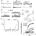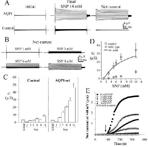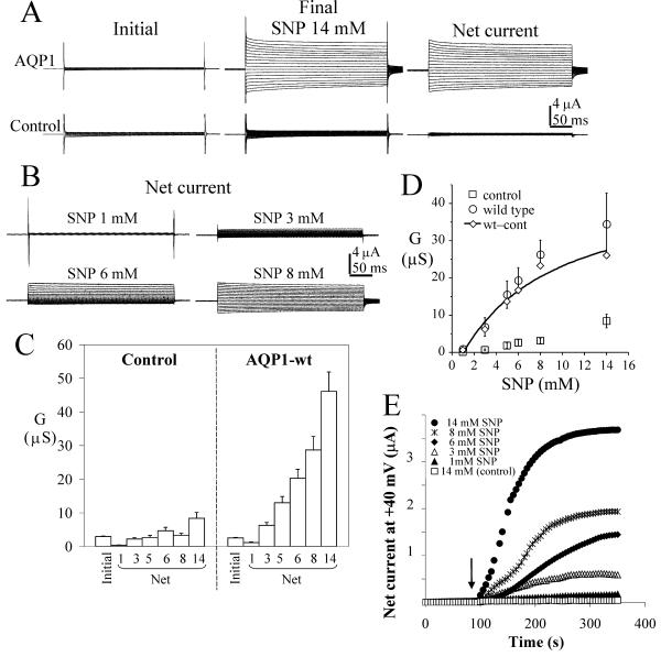 Figure 2. Wild type AQP1 channels show a dose-dependent ionic conductance response to the nitric oxide donor, sodium nitroprusside. A. Comparison of representative currents before and after 14 mM SNP in AQP1-expressing and control oocytes. Voltage steps were +60 mV to -110 mV in -10 mV intervals, from -40 mV holding potential. The net current is (final)-(initial). B. Dose-dependence of net current responses of wild type AQP1-expressing oocytes, with the same voltage protocol as in (A). C. Summary of data for conductance responses (mean ± SEM, n = 9–34 oocytes per group) at different doses of SNP (indicated in mM on horizontal axis). 'Initial' data are the conductance levels of the oocytes recorded prior to SNP application, and represent total conductance rather than net values. The net conductance responses were calculated by subtracting the matched initial values individually from the SNP response for each oocyte.D. Mean values ± SEM (n = 7 oocytes per group within the same batch of oocytes) are shown for net conductance responses to SNP for control (square) and AQP1-expressing oocytes (circle). The difference between mean net AQP1 and control conductances (diamond) was fit to estimate an EC50 value of 7.8 mM SNP; see text for details. E. Dose-dependent rate of activation of ionic current by SNP in representative AQP1-expressing oocytes, measured at 5 sec intervals with voltage steps to +40 mV from a holding potential of -40 mV. The arrow indicates the time of application of SNP in the recording chamber bath. Data prior to the application are superimposed.