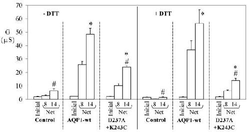 Figure 7. Effects of preincubation with the reducing agent dithiothreitol (DTT) on SNP-induced ionic conductances. Oocytes expressing AQP1 wild type and double mutant D237A + K243C channels, and control oocytes were preincubated in ND96 saline with and without 10 mM DTT for 1 hour prior to electrophysiological recording of the response to SNP. Initial data are prior to SNP application; net conductances are (final)-(initial) for the SNP doses (mM) as indicated. An asterisk (*) indicates values that are significantly different (p < 0.006) from control; the pound sign (#) indicates values that are significantly different (p < 0.0001) from wild type AQP1 (unpaired two-tailed Student's t test) for comparisons within the same treatment group (with or without DTT). For other statistical comparisons, see details in text.
