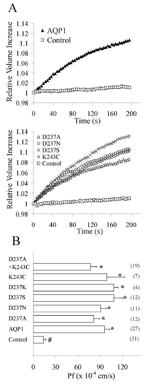 Figure 1. Osmotically induced swelling in oocytes expressing AQP1 wild type and C-terminal mutant channels. A. Relative volume increases were determined by videomicroscopy as a function of time after the transfer of the oocytes from 200 mOsM into 100 mOsM saline at time 0. The change in cross-sectional area of the oocyte was converted to volume to calculate relative volume increase and standardized to the initial volume at time zero. Data are shown for representative individual oocytes. Panels show data for control and AQP1 wild type- or mutant-expressing oocytes from within the same batches of oocytes. B. Summary of the osmotic water permeability (Pf) values for wild type and mutant channels. Data for Pf (cm/s × 10-4) are mean ± SEM; n values are shown in parentheses (right). Unpaired two-tailed Student's t tests were used to analyze significance. An asterisk (*) indicates a value that is significantly different (p < 0.0005) from control; the pound sign (#) indicates a value that is significantly different (p < 0.009) from wild type AQP1.