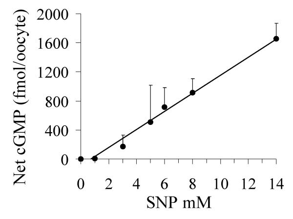 Figure 3. Intracellular cGMP produced in oocytes in response to SNP. Oocytes were tested in conditions comparable to those used for electrophysiological analyses, being assayed after 4 minutes of treatment with various concentrations of SNP in K+ recording saline. The amount of cGMP per oocyte was measured by enzyme immunoassay. Each point represents the mean of duplicate or triplicate measurements from four different experiments (separate batches of oocytes). Values shown are mean ± SEM.