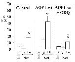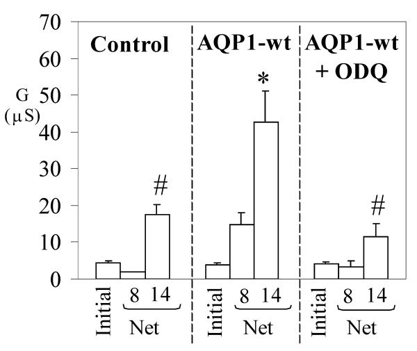 Figure 4. Inhibition of soluble guanylate cyclase prevents the AQP1 conductance response to SNP. Wild type AQP1-expressing and control oocytes were incubated three hours in ND96 saline with or without an inhibitor of soluble guanylate cyclase (1H-[1,2,4]oxadiazolo [4,3-a]quinoxalin-1-one, ODQ, 10 μM) prior to electrophysiological analysis of the response to SNP (doses indicated in mM on horizontal axis). Data are mean ± SEM; n = 3 or 4 oocytes per group. An asterisk (*) indicates values that are significantly different (p < 0.04) from control; the pound sign (#) indicates values that are significantly different (p < 0.04) from wild type AQP1 (unpaired two-tailed Student's t test).