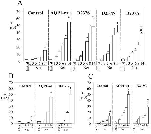 Figure 5. Summary of the effects of AQP1 C-terminal mutations on the net conductance responses evoked by SNP. Data are grouped to compare control, AQP1 wild type and mutant responses from within the same batches of oocytes. The mutants D237S, D237N (A) and D237K (B) showed dose-dependent responses to SNP (mM) comparable to that of wild type AQP1. However, the mutations D237A (A) and K243C (C) showed decreased conductance responses at all doses of SNP as compared with wild type. 'Initial' data are the conductance levels of the oocytes recorded prior to SNP application, and represent total conductance rather than net values. The net conductance responses were calculated by subtracting the matched initial values individually from the SNP response for each oocyte. Data are mean ± SEM; n = 3–28 oocytes per group. An asterisk (*) indicates values that are significantly different (p < 0.02) from control; the pound sign (#) indicates values that are significantly different (p < 0.04) from wild type AQP1 (unpaired two-tailed Student's t test).