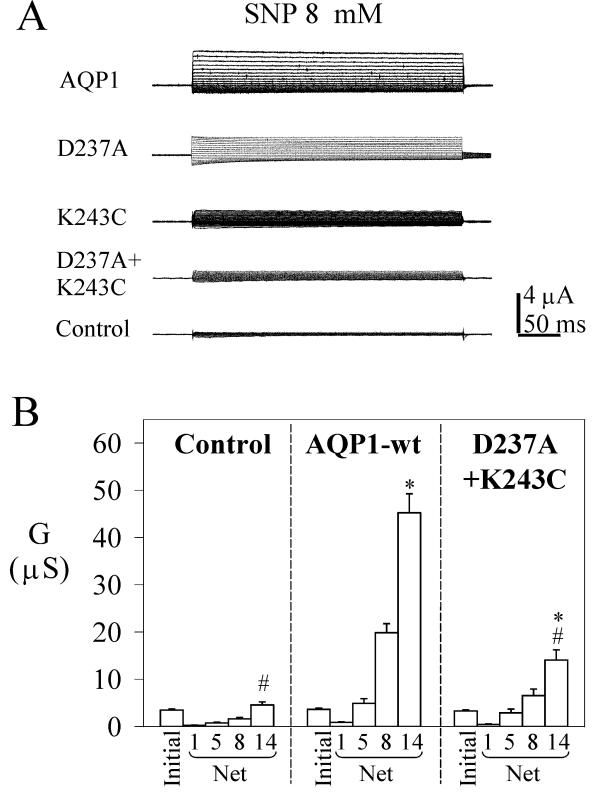 Figure 6. Double mutation D237A + K243C in the AQP1 carboxyl terminal domain shows a decreased conductance response to SNP as compared with wild type. A. Net current responses of control oocytes, and oocytes expressing AQP1 wild type and mutant channels were measured for voltage steps from +60 mV to -110 mV in -10 mV intervals, from -40 mV holding potential, after 4 minutes in 8 mM SNP. B. Summary of conductances (mean ± SEM, n = 9–18 oocytes per group) measured at different doses of SNP (mM). 'Initial' data are the conductance levels of the oocytes recorded prior to SNP application. The net conductance responses were calculated by subtracting the matched initial values individually from the SNP response for each oocyte. An asterisk (*) indicates values that are significantly different (p < 0.006) from control; the pound sign (#) indicates values that are significantly different (p < 0.0001) from wild type AQP1 (unpaired two-tailed Student's t test).