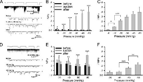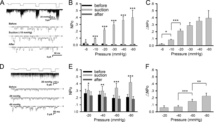 Fig. 1. Mechanosensitivity of AChRs in muscle cells. AChR activity was studied in cultured Xenopus myotomal muscle cells (a–c) and C2C12 myotubes (d–f). a Sample traces of ACh-induced single-channel currents from Xenopus muscle cells recorded with the patch-clamp method under negative pipette pressure of different magnitudes. Pipette ACh concentration = 0.2 μM, holding potential = +70 mV, cell-attached mode. b Channel activity NPo and c its difference ΔNPo under different negative pressures. For the NPo plot, values before (black), during (gray), and after (dark gray) negative pressure application are shown. Data are mean ± SEM, number of patches n = 9, 91, 46, 46, 44, 18 for negative pressures of −6, −10, −20, −30, −40, −60 mmHg, respectively. d AChR single channel currents recorded from C2C12 myotubes under different negative pressures. ACh concentration = 0.5 μM. e NPo values before (black), during (gray), and after (dark gray) negative pressure application. f ΔNPo data from C2C12 cells. Data from 20 patches at each negative pressure were pooled. Statistics: *p < 0.05; **p < 0.01; ***p < 0.001 (Student’s paired t test). For NPo plots, comparisons were made between values obtained during and before negative pressure application |