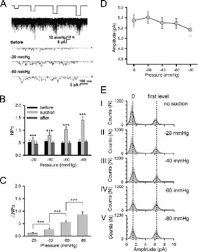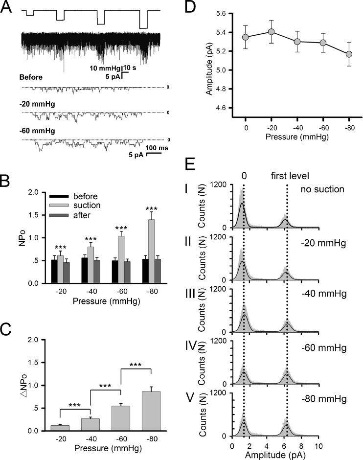 Fig. 2. Mechanosensitivity of AChRs exogenously expressed in HEK293T cells. Cells were transfected with AChR subunits α, β, δ, and γ. a Sample traces of ACh-induced currents under different negative pressures. Included in the pipette was 0.5 μM ACh. b Channel activity NPo and c its difference ΔNPo under different negative pressure levels; the former shows values before (black), during (gray), and after (dark gray) negative pressure application; n = 26, 24, 22, 10 patches for −20, −40, −60, −80 mmHg, respectively. Symbols denoting statistical significance are the same as in Fig. 1. d Mean amplitudes of single channel currents at different negative pressures. These values were calculated from all-points amplitude histograms as shown in (e), taking the difference between the first and second peak as the mean single-channel AChR current amplitude |