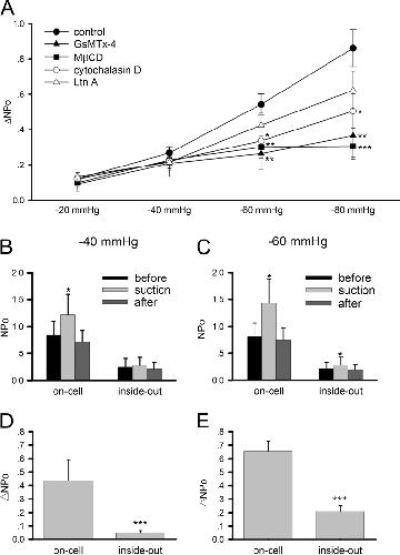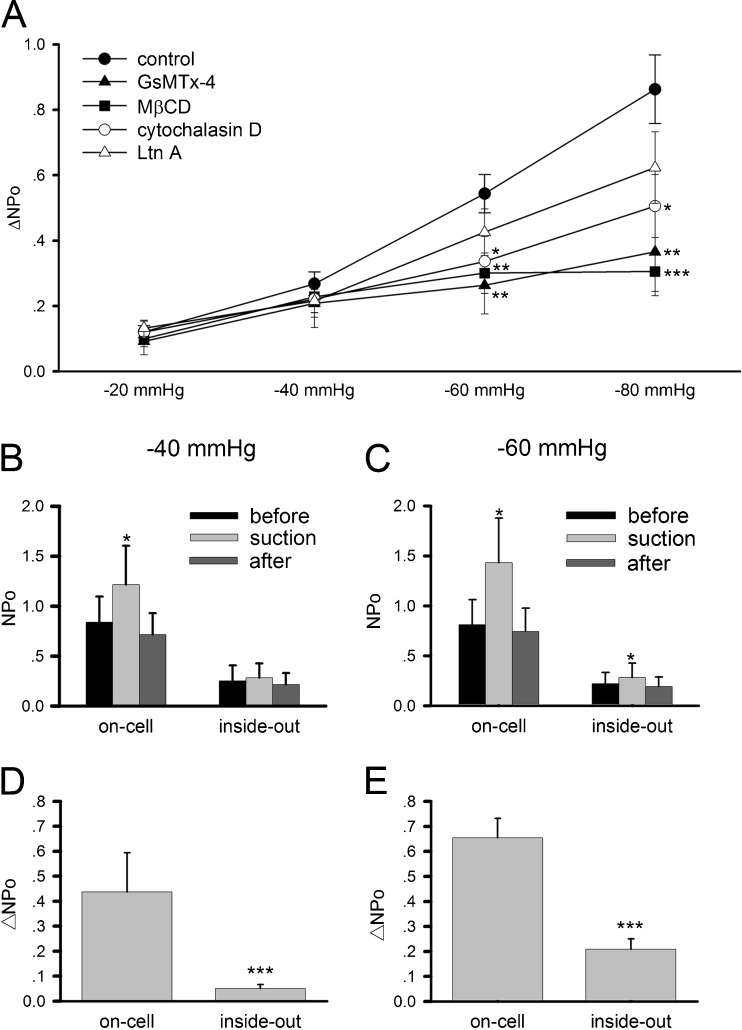 Fig. 3. Analyses of AChR mechanosensitivity in HEK293T cells. a Effects of different pharmacological agents on ΔNPo. Cell-attached single-channel recording was conducted. GsMTx-4 (1 μM), a mechanosensitive channel blocker, was included in the recording pipette. Cells were incubated before recordings for 20 min in 10 mM MβCD, a cholesterol-depleting agent; 30 min in 2 μM cytochalasin D, an F-actin inhibitor; or for 2 h in 5 μM latrunculin A, another F-actin inhibitor. Number of patches recorded: 26 (control), 26 (GsMTx-4), 19 (MβCD), 29 (cytochalasin D), and 19 (latrunculin A). b–e Comparison of on-cell and inside-out recordings. Data are mean ± SEM based on n = 10 patches (for each negative pressure). The same membrane patch was first recorded on-cell and then detached from the cell for inside-out measurement with a pipette holding potential of +70 mV and 0.5 μM ACh. *p < 0.05; **p < 0.01; ***p < 0.001 |