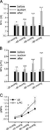 Fig. 4. Effect of LPC on AChR mechanosensitivity. AChR-expressing HEK293 cells were pretreated with LPC for 10 min before patch-clamp recording. a Channel activity NPo of AChRs before (black), during (gray), and after (dark gray) negative pressure application in control cultures; n = 16 patches. b NPo of LPC-treated AChRs; n = 16 patches. c The difference of NPo for control and LPC-treated AChRs at different negative pressure |
