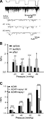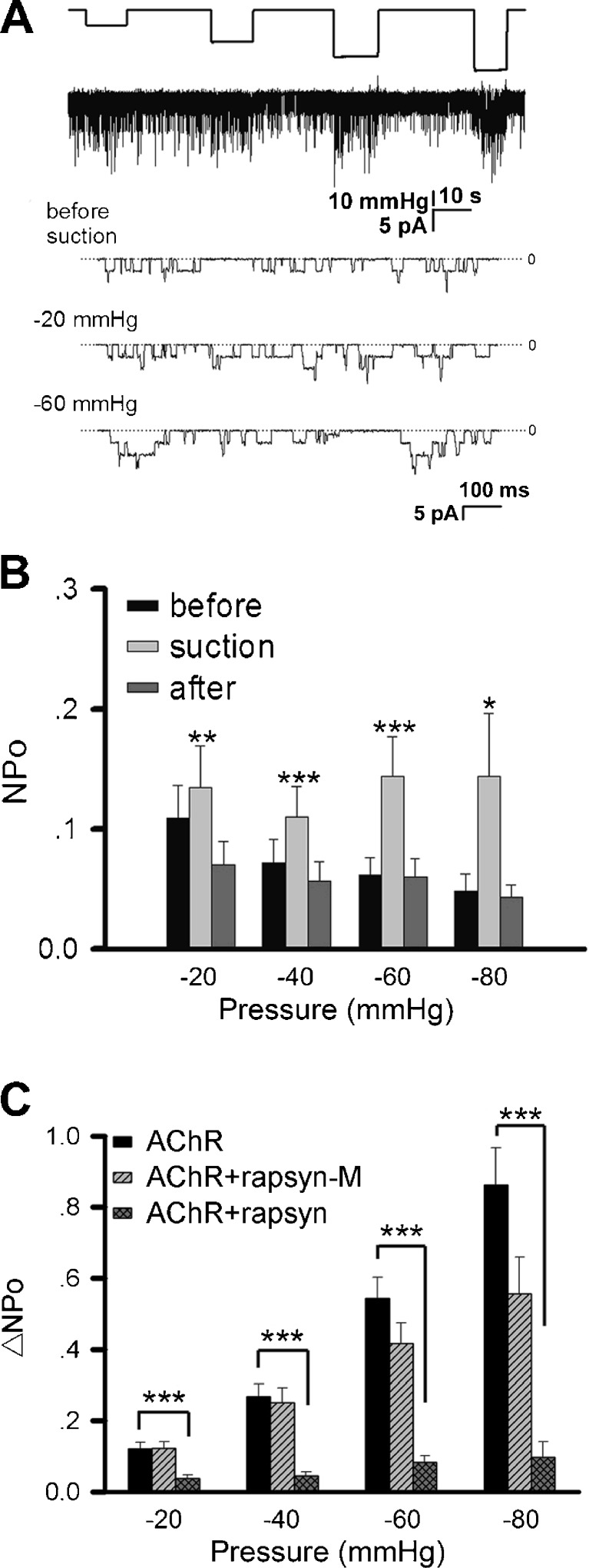 Fig. 5. The effect of rapsyn on AChR mechanosensitivity. HEK293T cells were transfected with cDNAs encoding AChR subunits plus one encoding rapsyn. a Sample current recording of AChRs under different pipette negative pressures in the cell-attached mode; pipette holding potential +70 mV with 0.5 μM ACh. b NPo of ACh-induced single-channel currents from rapsyn-co-expressing cells before (black), during (gray), and after (dark gray) negative pressure application. Note the reduced scale of y-axis compared to Figs. 1 and 2. Nâ=â21, 18, 11, 6 patches for â20, â40, â60, â80 mmHg, respectively. c ÎNPo values of AChRs expressed alone, with rapsyn or with mutant rapsyn lacking the AChR-binding domain (rapsyn-M). Data from 18 to 26 patches were pooled. *pâ<â0.05; **pâ<â0.01; ***pâ<â0.001 |