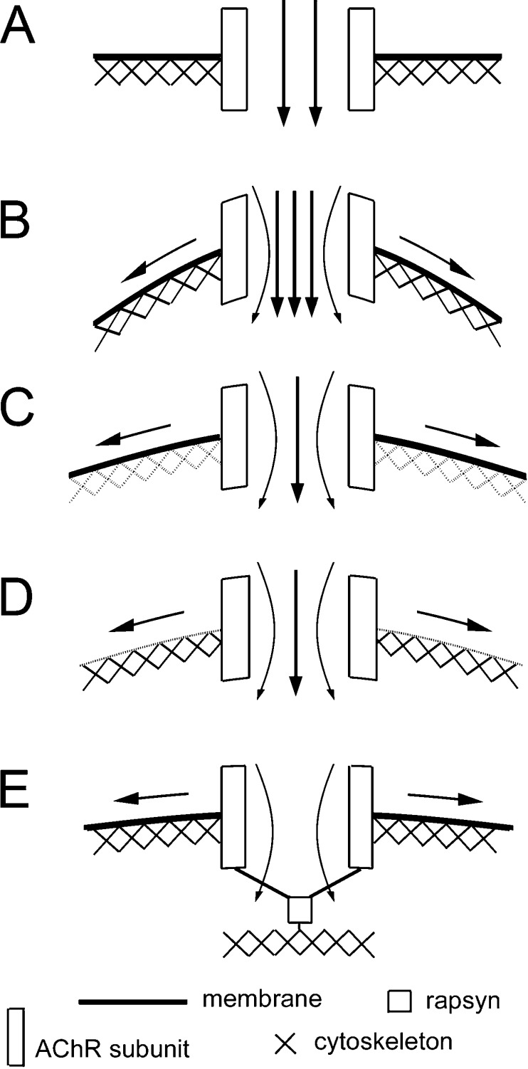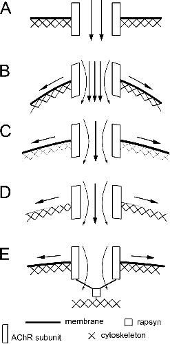 Fig. 7. A model on the regulation of AChR mechanosensitivity by the membrane and the cytoskeleton. a Channel opening under zero negative pressure. As a transmembrane molecule, AChRâs gating property can potentially be influenced by the mechanical properties of the membrane and the cytoskeleton. b Under negative pressure application through the recording pipette, the tension generated along the plane of the membrane causes increased channel activity. c Disruption of the cortical F-actin cytoskeleton by latrunculin A of cytochalasin D reduces the influence of the membrane stretch force on the receptor, leading to a decrease in channel activity. d Membrane lipid modification that reduces its stiffness such as cholesterol depletion by MβCD also reduces the stretch force experienced by the receptor and the mechanosensitivity. e Rapsyn, through its interaction with AChR subunits, anchors the receptor complex to the cytoskeleton to lessen the impact of membrane stress on its gating, thus reducing the mechanosensitivity |