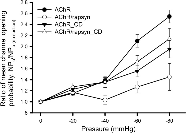 Fig. 6. Ratio of NPo under different experimental conditions. HEK293T cells expressing AChRs alone or together with rapsyn were recorded in the presence or absence of cytochalasin D (CD; 2 μM, 30 min pre-incubation). The NPo values obtained at each negative pressure were divided by the respective basal NPo. Data from more than 20 patches were pooled for each point. Studentâsât test showed no significant difference between the results of AChR_CD and AChR/rapsyn_CD (pâ>â0.2) |