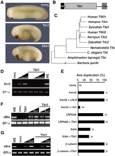Figure 1. Tiki1 Promotes Anterior Development and Inhibits Wnt Signaling(A) Dorsal injection of Tiki1 mRNA (100 pg) induced enlarged head similar to that induced by Dkk1.(B) Tiki1 domain scheme. SP, signal peptide; TM, transmembrane.(C) Phylogenetic tree of Tiki proteins from human, Xenopus, zebrafish, Nematostella, C. elegans, and Amphimedon by ClustalW (see Figure S1). TIKI domain is homologous to bacterial gumN (see Figure S2A).(D) Tiki1 inhibited Xwnt8-induced Xnr3 expression in animal caps. EF-1 alpha: a loading control; uninj: uninjected embryos; WE: whole embryos.(E) Tiki1 inhibited axis duplication by Xwnt8 but not by LRP6-delta-N, Xdsh, or beta-catenin. LDLR: a control. Numbers indicate embryos scored.(F and G) Tiki1 did not inhibit Nodal or FGF signaling.See also Figures S1 and S2. |