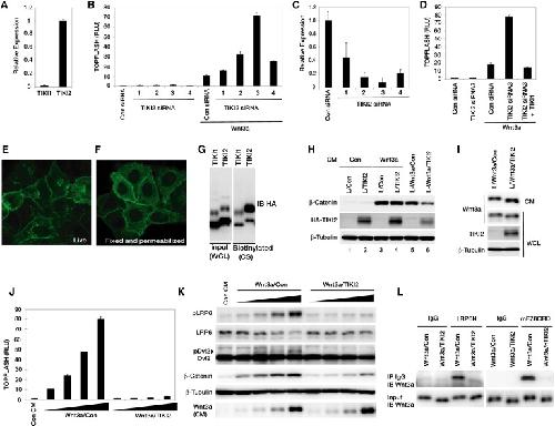 Figure 4. Tiki Inactivates Wnt3a(A) Relative expression levels of TIKI1 and TIKI2 mRNAs in HEK293T cells.(B) Knocking down endogenous TIKI2 in HEK293T cells enhanced Wnt3a signaling.(C) TIKI2 mRNA knockdown examined 48 hr after siRNA transfection.(D) The TIKI2 knockdown effect was countered by TIKI1 expression.(E and F) Immunofluorescence of HAâTiki1 expressed in HeLa cells. Live cells (E) or fixed-permeabilized cells (F) were labeled by an anti-HA antibody and a fluorescent secondary antibody.(G) HeLa cells expressing HA-TIKI1 or HA-TIKI2 were treated with a nonpermeable biotinylation reagent. Cell surface (CS) proteins were precipitated with streptavidin beads and blotted for HA-TIKI1/2. WCL: input whole-cell lysates. The slower-migrating form of HA-TIKI, due possibly to glycosylation, was enriched on the cell surface.(H) TIKI2 inhibited β-catenin stabilization in Wnt3a-expressing cells. Indicated L cell lines were also treated with control or Wnt3a CM for 2 hr (lanes 1â4). β-tubulin: a loading control.(I) Wnt3a was secreted similarly with or without TIKI2 but exhibited faster migration due to TIKI2.(J) Wnt3a CM from TIKI2-expressing L cells exhibited minimal activity, tested at concentrations in 2-fold dilutions.(K) Wnt3a CM from TIKI2-expressing L cells induced minimal LRP6 or Dvl2 phosphorylation or β-catenin stabilization at 2 hr. LRP6 intensity reduction was not due to decreased protein levels but due to LRP6 phosphorylation, which perturbed recognition by the LRP6 antibody used (not shown).(L) Wnt3a secreted from TIKI2-expressing cells exhibited minimal binding to mFz8CRD-IgG or LRP6N-IgG (Tamai et al., 2000).All error bars represent standard deviation (SD) in triplicates. See also Figure S4. |
