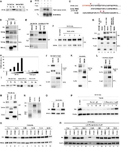 Figure 5. Tiki Inactivates Wnt3a via Amino-Terminal Cleavage(A) Triton X-114 phase separation. Control Wnt3a partitioned in detergent (De), but Wnt3a from TIKI2-expressing cells partitioned in aqueous (Aq) phase. T, total.(B) TIKI2 did not affect Wnt3a acylation (C77 plus S209) in metabolic labeling.(C) Amino-terminal cleavage of Wnt3a and Xwnt8 by TIKI2. The big and small arrowheads indicate major and minor cleavage sites, respectively (see Figure S5). Wnt3aδN was engineered to be identical to TIKI-cleaved Wnt3a.(D) TIKI cleaved the HA tag from HA-Wnt3a. TIKI1 cDNA was transfected at a 10-fold higher dose than that of TIKI2 for similar protein levels.(E) TIKI did not cleave Rspo1. ânonspecific.(F) Endogenous TIKI2 cleaved Wnt3a in HEK293T cells. TIKI2 siRNAs were as in Figures 4B and 4C.(G) Wnt3a(S25D/L26D) and Wnt3a(S25D/L26D/S33D/S34D) were partially and fully resistant to TIKI2N cleavage, respectively (lanes 4 and 6 versus 2). Both mutants exhibited slower mobility.(H) Wnt3aδN was inactive as examined by cDNA transfection in 2-fold dilutions. Error bars represent SD in triplicates.(I) Wnt3aδN in CM partitioned in the aqueous phase.(JâL) TIKI2 cleaved the HA tag from HA-Xwnt8-FLAG and HA-Wnt5a but not HA-Xwnt11-FLAG. Levels of KRM2N and TIKI2N (both FLAG-tagged) were monitored.(M) HA-Wnt3a was cleaved by TIKI2N, but not by KRM2N or TIKI2Nδ (FLAG-tagged), in HEK293T cells.(N) Silver staining of purified KRM2N, TIKI2N, or TIKI2Nδ.(O) Purified TIKI2N, but neither KRM2N nor TIKI2Nδ, cleaved recombinant HA-Wnt3a in vitro.(P) TIKI2N cleavage of HA-Wnt3a was inhibited by 1, 10-Phenanthroline but not Bestatin. Sixteen micromoles of 1, 10-Phenanthroline is about 100 times lower than manufacturer's recommended doses.(Q) TIKI2N cleavage of HA-Wnt3a was enhanced by Co2+ or Mn2+ but inhibited by Ni2+, Cu2+, or Zn2+.(R) TIKI2N inhibition by 1, 10-Phenanthroline was rescued by Co2+ or Mn2+ (lanes 6 and 8).See also Figures S4, S5, S6, and S7 and Table S4. |