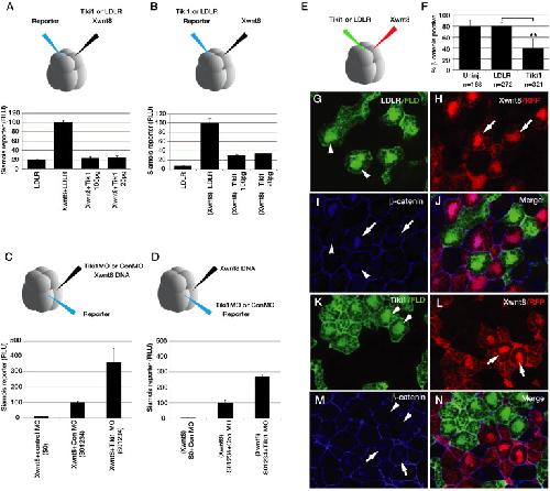 Figure 7. Tiki1 Functions in Both Wnt-Producing and Wnt-Responding Cells(A) Tiki1 acts in Xwnt8-producing cells. Tiki1 mRNA (100 pg) coinjected with Xwnt8 mRNA (20 pg) inhibited Xwnt8-induced S01234-luciferase in neighboring cells. LDLR: a control.(B) Tiki1 acts in Xwnt8-responding cells. Tiki1 mRNA coinjected with S01234-luciferase inhibited the reporter induced by Xwnt8 from neighboring cells that received Xwnt8 mRNA.(C) The endogenous Tiki1 acts in Wnt-producing cells. Tiki1MO (20 ng) coinjected with CS2+Xwnt8 DNA (40 pg) in a single dorsal blastomere enhanced Xwnt8-induced S01234-luciferase in neighboring cells. ConMO: control MO.(D) The endogenous Tiki1 acts in Wnt-responding cells. Tiki1MO coinjected with S01234-luciferase enhanced the reporter induced by Xwnt8 from neighboring cells that received CS2+Xwnt8 DNA.(EâN) Tiki1 reduces nuclear β-catenin levels by acting in Wnt-responding cells. Tiki1 or LDLR mRNA (200 pg) (FLD+, green) and Xwnt8 mRNA (20 pg) (RFP+, red) were injected into neighboring blastomeres. Stage 9 animal cap cells were imaged with an anti-β-catenin antibody (blue). Examples of Xwnt8-expressing cells (arrows) and Tiki1- or LDLR-expressing cells (arrowheads) are highlighted. Only cells within the distance of five cell bodies from Xwnt8-expressing cells were counted. No nuclear β-catenin-positive cells were found in areas free of Xwnt8-expressing cells (not shown). All cells were positive for plasma membrane-associated β-catenin. Statistical data were derived from three independent experiments (F). ââp < 0.001.All error bars represent SD in triplicates. See also Figures S7. |
