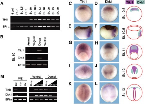 Figure 2. Tiki1 Expression and Regulation in Early Embryos(A) RT-PCR revealed that Tiki1 mRNA is detectable from stages 9 to 30.(B) Tiki1 is expressed dorsally. Embryos were cut into animal, vegetal, dorsal, and ventral parts for RT-PCR. Xnr3: a positive control.(CâL) Whole-mount in situ hybridization of Tiki1 and Dkk1 during gastrulation. Drawing is on right. (C and D) Vegetal view, dorsal on top; (E and F) hemisection, dorsal on right; (GâL) dorsal view, anterior on top.(M) Tiki1 expression depends on maternal Wnt signaling. Con: control, UV: ultraviolet. |