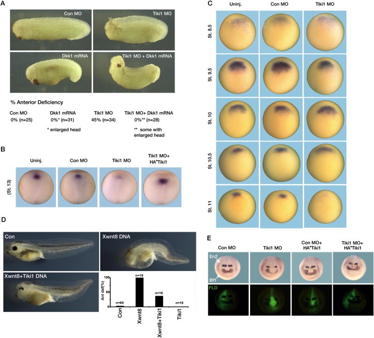 Figure 3. Tiki1 Is Required for Anterior Development(A) Tiki1MO (5, 10, 20, and 40 ng) inhibited protein expression from Tiki1-FLAG but not HAâTiki1 mRNAs (500 pg).(B) Tiki1MO (20 ng) caused anterior defects, which were rescued by HAâTiki1 mRNA (50 pg). Lateral (left) and dorso-anterior (right) views are shown at stage 42.(C) Statistical data of the Tiki1MO phenotype.(D) Tiki1MO suppressed head organizer gene expression at stages 10.5â11. See also Figure S3 and Tables S1, S2, and S3. |