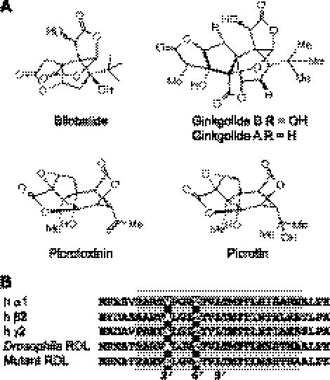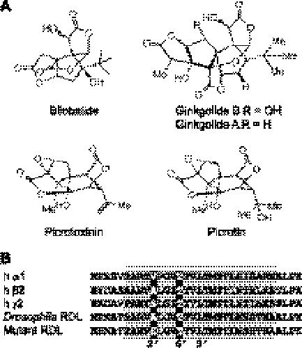 Figure 1. Compounds (A) and amino acid alignment of the M2 region (shaded) of the subunits (B) used in this study. Residues important for binding channel blockers are highlighted. Subunit accession numbers: human GABA α1, P14867; human GABA β2, P47870; human GABA γ2, P18507; Drosophila RDL, P25123. |