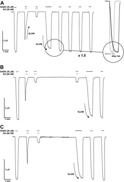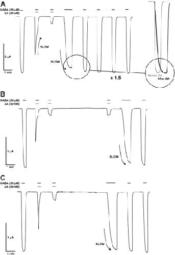 Figure 2. Typical experiments showing that the inhibition of GABA responses in RDL receptors is slow to develop and wash out. A) Following an application of GABA alone, coapplication of GA with GABA shows that the response reaches 60% of maximal before it is slowly inhibited. A stable level of inhibition is only reached with a subsequent coapplication of GA and GABA. B) The level of inhibition is unchanged even after a long washout. C) Following inhibition, activation is slow but is independent of the wash time between agonist applications. This suggests that GA becomes trapped within the channel, and only slowly leaves the open channel on agonist application. Preapplication did not change ginkgolide potency, consistent with access also requiring an open channel. In this work, all concentration-inhibition curves and the derived parameters were calculated from measurements taken during a second, stable, level of inhibition. Ginkgolides were obtained as previously described (19). |