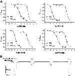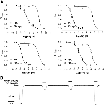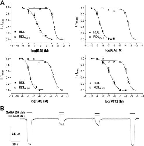 Figure 4. Ginkgolide potency at RDLA2â²V mutant receptors. A) Concentration-inhibition curves for RDLA2â²V mutant receptors show that ginkgolide potency is significantly decreased compared to wild-type receptors. Values are expressed as means ± se, with sample size and other parameters shown in Table 2. B) Typical responses from an RDLA2â²V mutant receptor show that onset and recovery from inhibition are faster in these receptors. |
