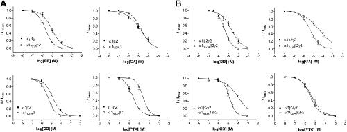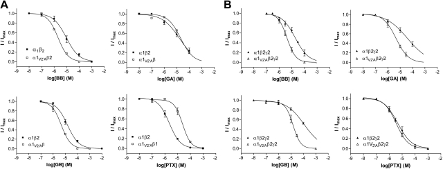 Figure 5. Ginkgolide potency at wild-type and mutant α1β2 (A) and α1β2γ2 (B) GABAA receptors. Concentration-inhibition curves show that ginkgolide potency is mostly increased compared to wild-type receptors, although PTX potency is either decreased (α1V2â²Aβ2 receptors; A) or unchanged (α1V2â²Aβ2γ2 receptors; B). Values are expressed as means ± se, with sample size and other parameters shown in Table 2. |