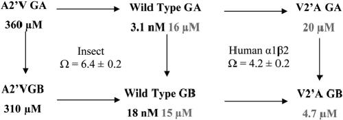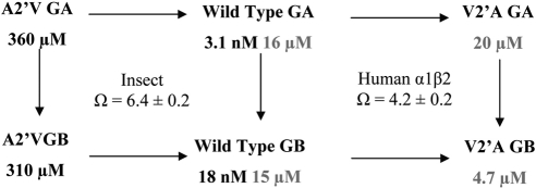 Figure 6. Mutant cycle analysis of interactions between ginkgolides and the 2′ residue. IC50 values from RDL receptors are at left; those from human GABAA receptors are at right. A coupling parameter (Ω) was calculated from IC50 values (Table 2) using the standard equation Ω = IC50 wtL1 × IC50 mutL2/IC50 wtL2 × IC50 mutL1, where wt = wild type, mut = mutant, and L1 and L2 are the ligands GA and GB, respectively. |