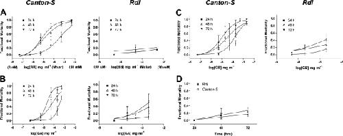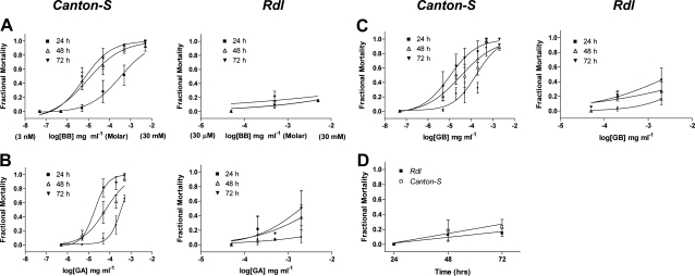 Figure 7. Insecticidal activities of ginkgolides in wild-type (CantonS) and dieldrin-resistant (Rdl) adult D. melanogaster in coated vial bioassays. AâC) Fractional mortality is plotted against ginkgolide concentration (mg/ml): BB (A), GA (B), GB (C). In panel A, molar equivalents are shown in parentheses. D) Mortality in the absence of compound. The resistant strain carries a target-site mutation (A2â²S) in its Rdl gene that confers resistance (no significant mortality up to 72 h) to the cyclodiene insecticide dieldrin; in wild-type flies, LD50 was 2.0, 2.0 and 1.7 μg/ml at 24, 48, and 72 h, respectively. The resistant strain survived well at the highest concentrations of ginkgolides tested, showing that a mutation at the 2â² residue confers cross-resistance. For the wild-type strain, data are fitted with a 4-parameter logistic equation, yielding the LD50 values shown in Table 3. Comparable data could not be derived for Rdl, owing to its resistance to the compounds. Values are means ± se for the sample size shown. Similar experiments with PTX revealed no toxicity in either batch of flies, probably due to access problems, as in previous studies (28). |