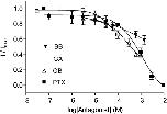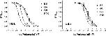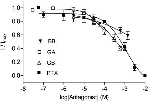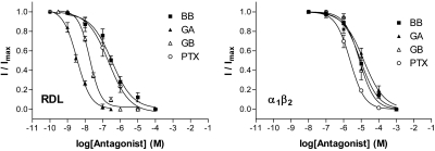 Figure 9. Ginkgolide concentration-inhibition curves at RDLT6â²V mutant receptors. Gingkolides inhibited GABA-activated responses only at high concentrations, with values of IC50 > 100 μM. Values are means ± se, with sample size and other parameters shown in Table 4. |