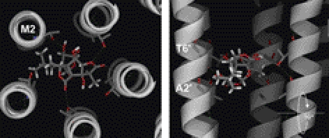 Figure 8. Docking of ginkgolides to wild-type RDL receptors. All ginkgolides and PTX docked at a similar location; here, GB is shown as a typical example. From above, it can be seen to fit snugly in the pore between the 5 M2 helices; from the side, it is located between the 2′ and 6′ residues, where it forms hydrogen bonds with 6′Thr residues. |