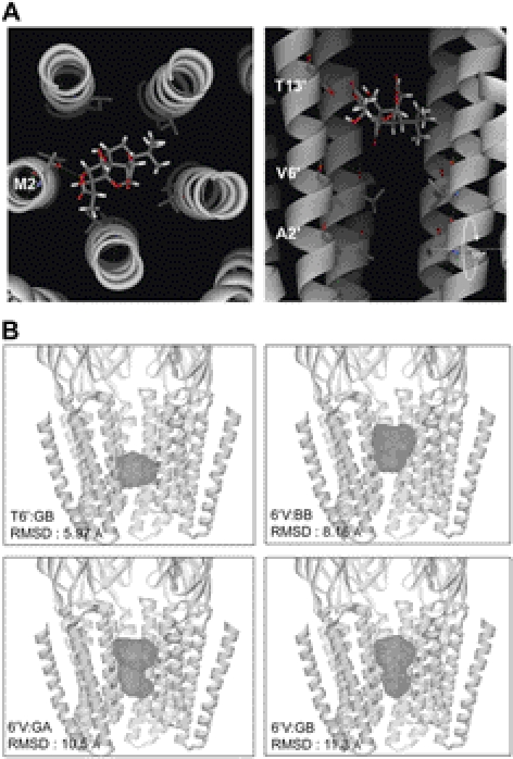 Figure 10. Docking at RDLT6′V mutant receptors. A) Docked pose for GB using the same template as in Fig. 8. B) Locations of 10 docked poses are superimposed to show the distributions of ginkgolides in the channel. These data show that all ligands docked ∼10 Å higher in the channel compared with wild-type receptors. In addition, the poses of GB in the wild-type (T6′) receptor are closely clustered, while in RDLT6′V (6′V) receptors, they are more widely distributed. RMSD for clusters is shown at bottom left in each panel. |