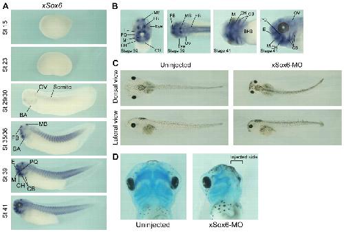 Fig. 4. xSox6 is required for craniofacial cartilage formation. (A) Whole-mount in situ hybridization for xSox6 was performed on embryos at stages 15, 23, 29/30, 35/36, 39 and 41. OV, otic vesicle; BA, branchial arch; FB, forebrain; MB, midbrain; E, ethmoid cartilage; PQ, palatoquadrate cartilage; M, Meckelâs cartilage; CH, ceratohyal cartilage; CB, ceratobranchial cartilage. (B) Magnified view of the head of embryos shown in A. FB, forebrain; MB, midbrain; HB, hindbrain; OV, otic vesicle; CG, cement gland; E, ethmoid cartilage; PQ, palatoquadrate cartilage; M, Meckelâs cartilage; CH, ceratohyal cartilage; CB, ceratobranchial cartilage; BHB, basihyobranchial cartilage. (C) xSox6-MO was injected into the animal pole of all blastomeres (10 ng/cell) at the four-cell stage, and the embryos were fixed at stage 45. (D) xSox6-MO was injected unilaterally into the animal pole of two blastomeres (10 ng/cell) at the four-cell stage. Uninjected and injected embryos were fixed at stage 45, and cartilages were stained with Alcian Blue. |