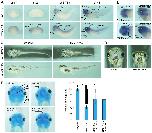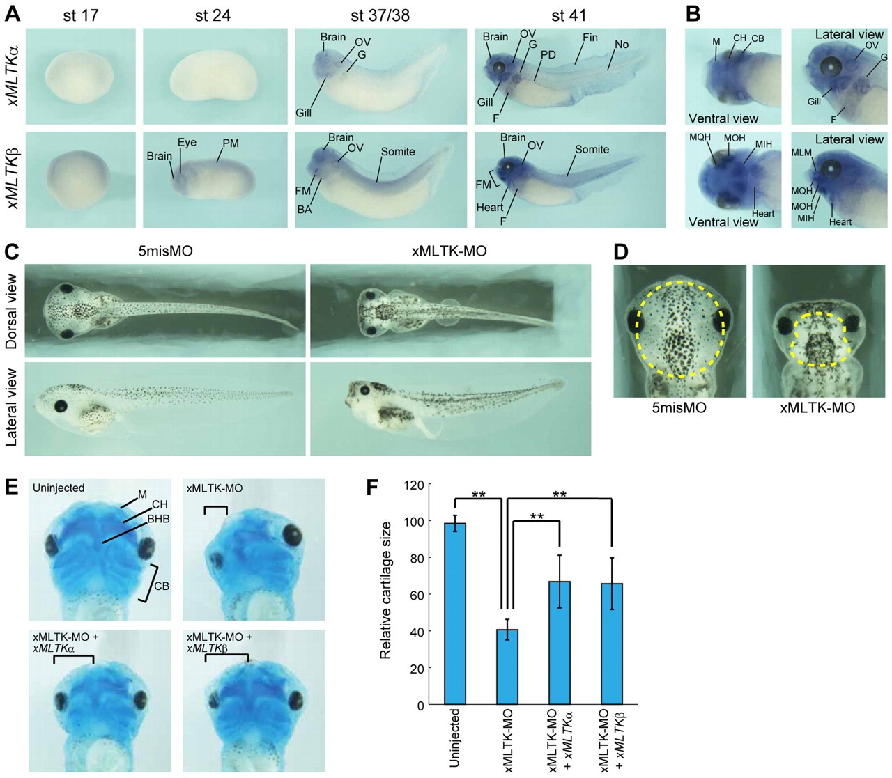 Fig. 1. xMLTK is required for craniofacial cartilage formation. (A) Whole-mount in situ hybridization for xMLTKα and xMLTKβ was performed on embryos at stages 17, 24, 37/38 and 41. OV, otic vesicle; G, glomus; PD, pronephric duct; No, notochord; F, left-rostral furrow in yolk mass; PM, paraxial mesoderm; FM, facial muscle; BA, branchial arch. (B) Magnified view of embryos at stage 41 shown in A. M, Meckelâs cartilage; CH, ceratohyal cartilage; CB, ceratobranchial cartilage; OV, otic vesicle; G, glomus; F, left-rostral furrow in yolk mass; MQH, m. quadrato-hyoangularis; MOH, m. orbitohyoideus; MIH, m. interhyoideus; MLM, m. levator mandibulae. (C) xMLTK-MO or 5misMO was injected into the animal pole of all blastomeres (10 ng/cell) at the four-cell stage, and the embryos were fixed at stage 45. (D) Magnified view of the head of the embryo shown in C. Craniofacial cartilage is outlined with a dashed yellow line. (E) xMLTK-MO (n=29), xMLTK-MO plus xMLTKα-res-myc plasmid (n=25), or xMLTK-MO plus xMLTKβ-res-myc plasmid (n=25) was injected unilaterally into the animal pole of two blastomeres (xMLTK-MO, 10 ng/cell; plasmid, 50 pg /cell) at the four-cell stage. Uninjected embryos (n=31) and injected embryos were fixed at stage 45, and cartilages were stained with Alcian Blue. Brackets indicate the injected side. M, Meckelâs cartilage; CH, ceratohyal cartilage; CB, ceratobranchial cartilage; BHB, basihyobranchial cartilage. (F) The relative cartilage size (the rate of the length of the right side to that of the left side of ceratohyal cartilages) was quantified. Values are mean±s.d. **P<0.01. |