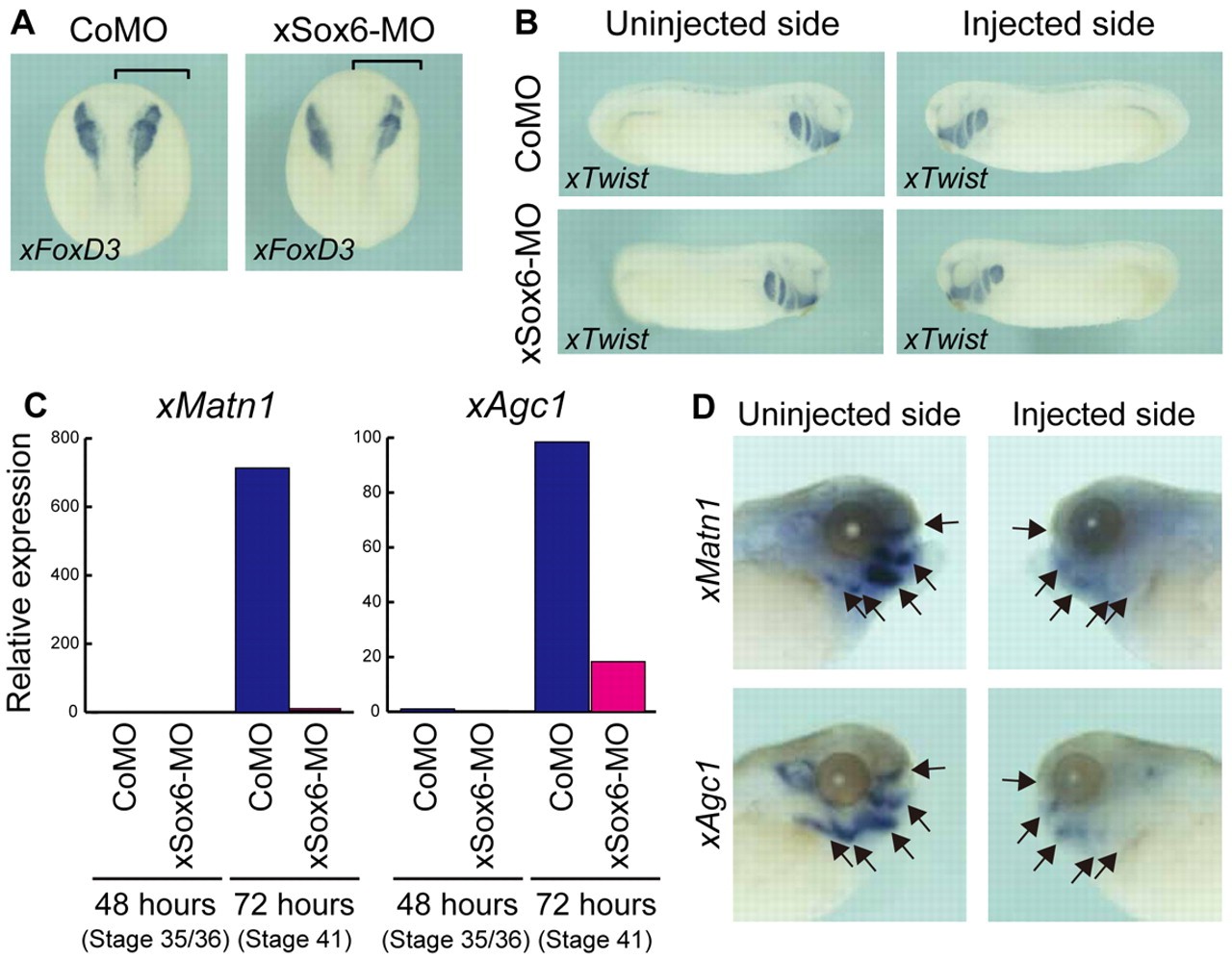 Fig. 5. xSox6 is required for chondrocyte differentiation but not for neural crest development. (A,B) xSox6-MO or CoMO was injected unilaterally into the animal pole of two blastomeres (10 ng/cell) at the four-cell stage, and the embryos were fixed at stages 17 (A) and 25 (B). Whole-mount in situ hybridization was performed with xFoxD3 (A) and xTwist (B) probes. Brackets indicate the injected side. Frequency of specimen with the indicated phenotype (nearly equal expression) was CoMO in A, 5/5; xSox6-MO in A, 18/21; CoMO in B, 5/5; xSox6-MO in B, 11/11. (C) xSox6-MO or CoMO was injected into the animal pole of all blastomeres (10 ng/cell) at the four-cell stage. Embryo heads were harvested 48 and 72 hours after fertilization (stages 35/36 and 41, respectively). The expression levels of chondrocyte markers xMatn1 and xAgc1 were analyzed by qRT-PCR. Representative results from two independent experiments are shown. (D) xSox6-MO was injected unilaterally into the animal pole of two blastomeres (10 ng/cell) at the four-cell stage, and the embryos were fixed at stage 41. Whole-mount in situ hybridization was performed with xMatn1 and xAgc1 probes. Arrows indicate presumptive cartilaginous elements. Frequency of specimen with the indicated phenotype (markedly reduced expression) was Matn1, 11/12; Agc1, 10/10. |