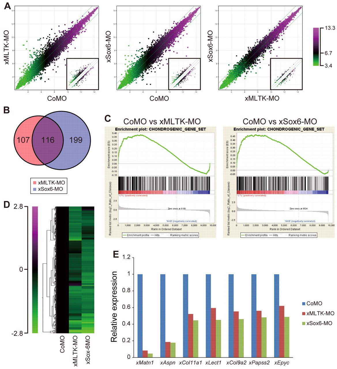 Fig. 6. Genome-wide gene expression analysis of xMLTK- and xSox6-depleted embryos. CoMO, xMLTK-MO, or xSox6-MO was injected into the animal pole of all blastomeres (10 ng/cell) at the four-cell stage. The heads of embryos were cut out and harvested at 72 hours after fertilization (corresponding to stage 41). (A) Scatter plots showing signal intensity of all probe sets, which is represented by color according to the log scale on the right. Inset scatter plots show only the dots representing probe sets whose signal intensity changed more than twofold. (B) Venn diagram of the number of genes whose expression levels were more than halved in xMLTK-MO- or xSox6-MO-injected embryos. (C) Gene set enrichment analysis was performed to assess overrepresentation of chondrogenic gene set. The bottom region of the plot shows the log ratio of signal intensity of each gene in CoMO-injected embryos to that in xMLTK-MO- or xSox6-MO-injected embryos. Genes were ranked from left to right according to the ratio. The middle region shows where the genes in the chondrogenic gene set appear in the ranked list. The top region shows the running enrichment score (ES) for the chondrogenic gene set, calculated by walking down the ranked list of genes from left to right, increasing a running-sum statistic when a gene is in the gene set and decreasing it when it is not. The score at the peak is the ES. The normalized ES and P-value in CoMO versus xMLTK-MO are 1.4 and less than 0.001, respectively, and those in CoMO versus xSox6-MO are 1.7 and less than 0.001, respectively. (D) Expression profiles of genes whose expression levels were more than halved in xMLTK-MO- or xSox6-MO-injected embryos. The ratio of signal intensity in xMLTK or xSox6 morphants relative to that in control morphants is represented by color according to the scale on the left. Genes were rearranged by clustering analysis. (E) Signal intensity of cartilage-expressed genes in xMLTK-MO- and xSox6-MO-injected embryos relative to that in CoMO-injected embryos. |