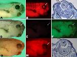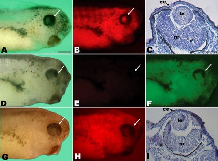 Figure 5. Specificity of Xenopus MADM-like (xMADML) morpholino (MO). Stage 35 animals developing from embryos injected unilaterally at the two-cell stage with 18 ng of indicated morpholino. A,B,DâH: Anterior is right and dorsal is up. Arrows indicate the location of eye. C,I: Dorsal is to the right and distal is up. AâC: Rescue phenotype by means of coinjection of 18 ng of xMADML-MO and 500 pg of ALT-xMADML mRNA. DâF: With 18 ng of green fluorescent xMADML-MO and 1 ng of xMADML-DsRED2-N1 fusion construct. D: Animal with mild defect after xMADML-MO injection. E: Lack of red fluorescence, showing that xMADML-MO has prevented the translation of the fusion protein. F: Green fluorescence showing the presence of xMADML-MO. GâI: Injection of 1 ng of xMADML-DsRED2-N1 fusion plasmid alone. G: Brightfield view. H: High degree of red fluorescence, indicating expression of the fusion construct. I: Section of fusion construct-injected eye, showing normal morphology. ce, corneal epithelium; le, lens; nr, neural retina. Scale bars = 400 μm in A,B,DâH, 100 μm in CâI.Download figure to PowerPoint