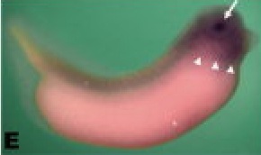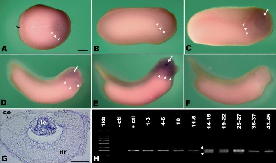 Figure 2. Xenopus MADM-like (xMADML) expression. A-F: Embryonic expression of xMADML by in situ hybridization. Anterior is to the right in all cases. White arrowheads denote the rightlateral extent of anterior staining, and white arrows indicate eye and lens placode staining. A is a dorsal view, dorsal is up in B-F. A: Stage 14: faint xMADML expression visible in the anterior neural plate. The black arrowhead indicates the blastopore, and the dotted line indicates the dorsal midline of the embryo. B: Stage 19: faint xMADML expression visible in a region of the anterior neural plate and adjacent headectoderm. C-E: Stages 25, 32, and 35, respectively: revealing expression in the presumptive lensectoderm (PLE), lens, retina, and surrounding areas. F: Stage 35 sense control showing no staining. G: Section of eye of animal shown in E. H: RT-PCR analysis of xMADML expression in stages as noted. Lane 1 is the 1-kb DNA ladder, lane 2 is a negative control, and lane 3 is positive control plasmid. The white arrow indicates the expected 1,513-bp amplified product, based on the full-length cDNA coding sequence recovered. The white arrowheads indicate two alternative splice forms (see text). ce, corneal epithelium; le, lens; nr, neural retina. Scale bar = 400 mu m in A-F, 100 mu m in G.