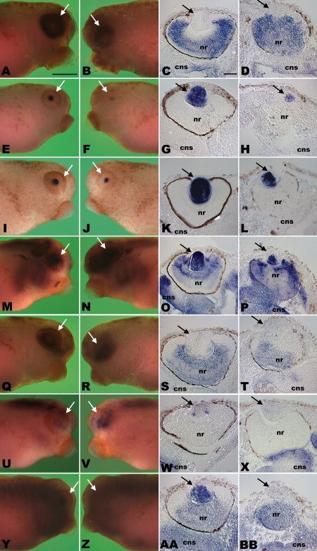 Figure 8. In situ analysis of selected genes in Xenopus MADM-like (xMADML) morpholino (MO) animals. Embryos injected unilaterally with 18 ng of xMADML-MO at the two-cell stage and showing severely defective eye phenotypes at stage 35 were fixed and assayed for expression of specific genes as indicated below. Each row of panels show staining of one gene. The first column shows the control (nonâxMADML-MO injected) side of animals showing the normal in situ expression pattern for each gene. Anterior is to the right and dorsal is up. The second column shows the xMADML-MOâinjected side of animals, showing the in situ expression pattern in the knockdown phenotype. Anterior is to the left and dorsal is up. The third column shows a section of the control (uninjected) eye. Distal is up and dorsal is to the left. The fourth column shows a section of the xMADML-MOâinjected eye. Distal is up and dorsal is to the right. AâD:Xotx2 staining. EâH:XL-maf staining. IâL: γ6-crystallin staining. MâP:Sox2 staining. QâT:xSix3 staining. UâX:Sox3 staining. YâBB:Pax6 staining. The white arrow indicates the eye, the black arrow indicates the lens. nr, neural retina; cns, neural tube. Scale bar = 400 μm in the first two columns, 100 μm in the last two columns.Download figure to PowerPoint