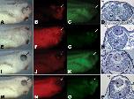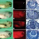 Figure 4. Morpholino phenotype. Stage 35 animals developing from embryos injected unilaterally at the two-cell stage with 18 ng of indicated morpholino (MO). Each row shows one embryo in whole-mount in both white light and red morpholino fluorescence and the affected eye in section in transmitted light. For panels in the first two columns, anterior is to the right and dorsal is up. Arrows indicate the location of eye. For the panels in the third column, dorsal is to the right. AâC: Uninjected control animal. DâF:Xenopus MADM-like (xMADML) -MO injected animal. Mild phenotype showing reduced development of ventralretina and poorly differentiated, misorganized fiber cells in the lens. GâI: xMADML-MO injected animal. Severe phenotype showing retina and lens with severely impaired gross morphology. JâL: Control morpholino (CTL-MO) -injected animal exhibiting normal morphology. ce, corneal epithelium; le, lens; nr, neural retina. Scale bar = 400 μm in the first two columns, 100 μm in the third column.Download figure to PowerPoint