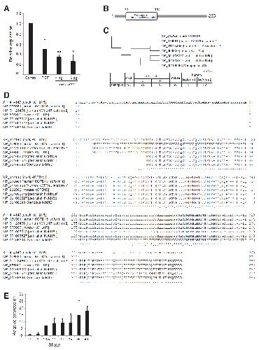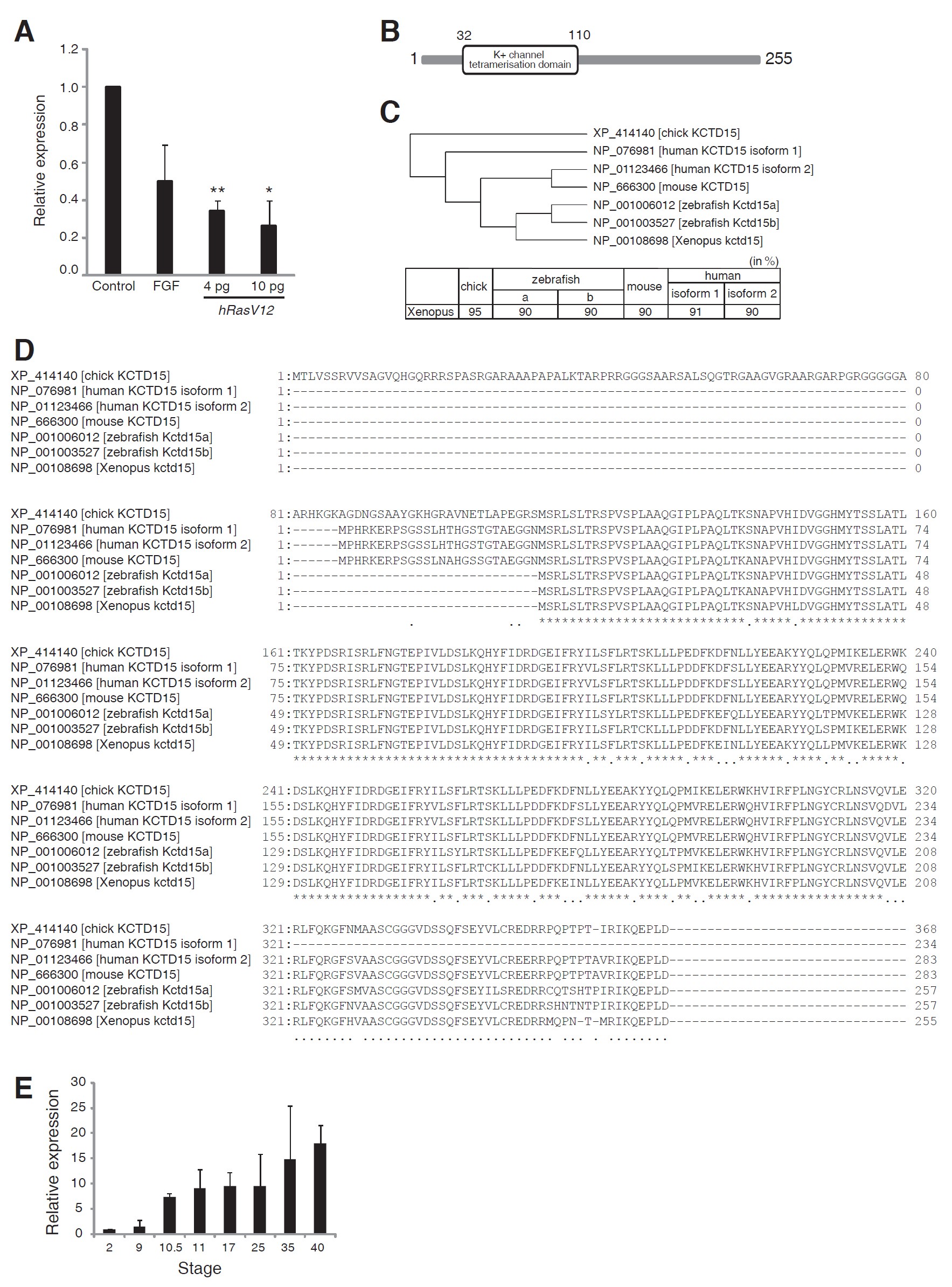 Fig. 1. Evolutionary conservation of Xenopus kctd15, a novel FGF-repressed gene. (A) Xenopus Kctd15 expression is repressed by FGF or RasV12 in ectodermal explants. hRasV12 mRNA was injected into the animal poles of four-cell stage embryos. Ectodermal explants derived from uninjected or injected embryos were left untreated or treated with 100 ng/ml FGF. At stage 11, explants were harvested for RNA preparation. The expression level of kctd15 was determined by real-time quantitative RT-PCR and normalized relative to that of ef1a. Shown is the average of two independent experiments. The error bar represents the standard deviation (SD). Significant differences are marked by asterisks (*p < 0.05, **p < 0.01, unpaired t test). P values versus control were as follows: 0.067 for FGF-treated explants, 0.0030 for hRasV12 mRNA (4 pg)-injected explants, and 0.016 for hRasV12 mRNA (10 pg)-injected explants. (B) Schematic representation of Xenopus kctd15 protein. Xenopus kctd15 consists of 255 amino acids and has the potassium channel tetramerization domain at the N-terminus. (C) A phylogenetic tree of vertebrate KCTD15 proteins. The tree was drawn by the BLAST TreeView Widget (http://blast.ncbi.nlm.nih.gov/). Genetic distances were calculated from the aligned sequences by using the Grishin distance model. The tree was built with the Fast Minimum Evolution method. Identity of amino acid sequences among vertebrate KCTD15 orthologs is shown in the table. (D) Alignment of vertebrate KCTD15 protein sequences. Asterisks mark amino acid residues conserved in all species. Periods mark amino acid residues conserved in at least 4 out of 7 species. (E) Temporal expression of Xenopus kctd15 in early development. The total RNA isolated from embryos at indicated stages was subjected to real-time quantitative RT-PCR. The expression level of kctd15 was normalized relative to that of odc. Shown is the average of two independent experiments. The error bar represents the standard deviation (SD). |