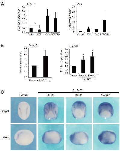 Fig. 3. FGF signaling inhibits Xenopus kctd15 expression in vivo. (A) FGF represses kctd15 expression indirectly. Animal caps were dissected at stage 10.25, treated with FGF (100 ng/ml) for 3 hours in the presence or absence of cycloheximide (CHX; 5 mg/ml), and then harvested for real-time quantitative RT-PCR analysis. Shown is the average of two independent experiments. The error bar represents SD. Significant differences are marked by asterisks (*p < 0.05, unpaired t test). P values (FGF treatment versus no FGF treatment) were as follows: 0.024 for kctd15 expression in the absence of CHX, 0.80 for kctd15 expression in the presence of CHX, 0.23 for xbra expression in the absence of CHX, and 0.24 for xbra expression in the presence of CHX. (B) Inhibition of FGF signaling increases the abundance of kctd15 mRNA. XFD mRNA (1 ng) was injected into animal poles at 2-cell stage, and injected embryos were harvested at stage 11 for real-time quantitative RT-PCR analysis (left). Embryos were treated with indicated doses of SU5402 at stage 9, and then harvested at stage 11 for real-time quantitative RT-PCR analysis (right). Shown is the average of two (left) or three (right) independent experiments. The error bar represents SD. *P < 0.05, unpaired t test. P values versus control were as follows: 0.14 for XFD mRNA-injected embryos, 0.031 for SU5402 (50 mM)-treated embryos, and 0.015 for SU5402 (100 mM)-treated embryos. (C) Inhibition of FGF signaling dramatically expands the region expressing kctd15. Embryos were treated with indicated doses of SU5402 at stage 9, fixed at stage 15, and then subjected for whole mount in situ hybridization against kctd15. Upper panels show dorsal views with anterior toward the top. Lower panels show lateral views with anterior to the left. White arrowheads indicate unclosed blastopores, which are commonly observed phenotypes caused by inhibition of the FGF pathway (Amaya et al., 1991; Chung et al., 2004). |