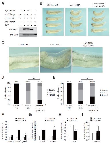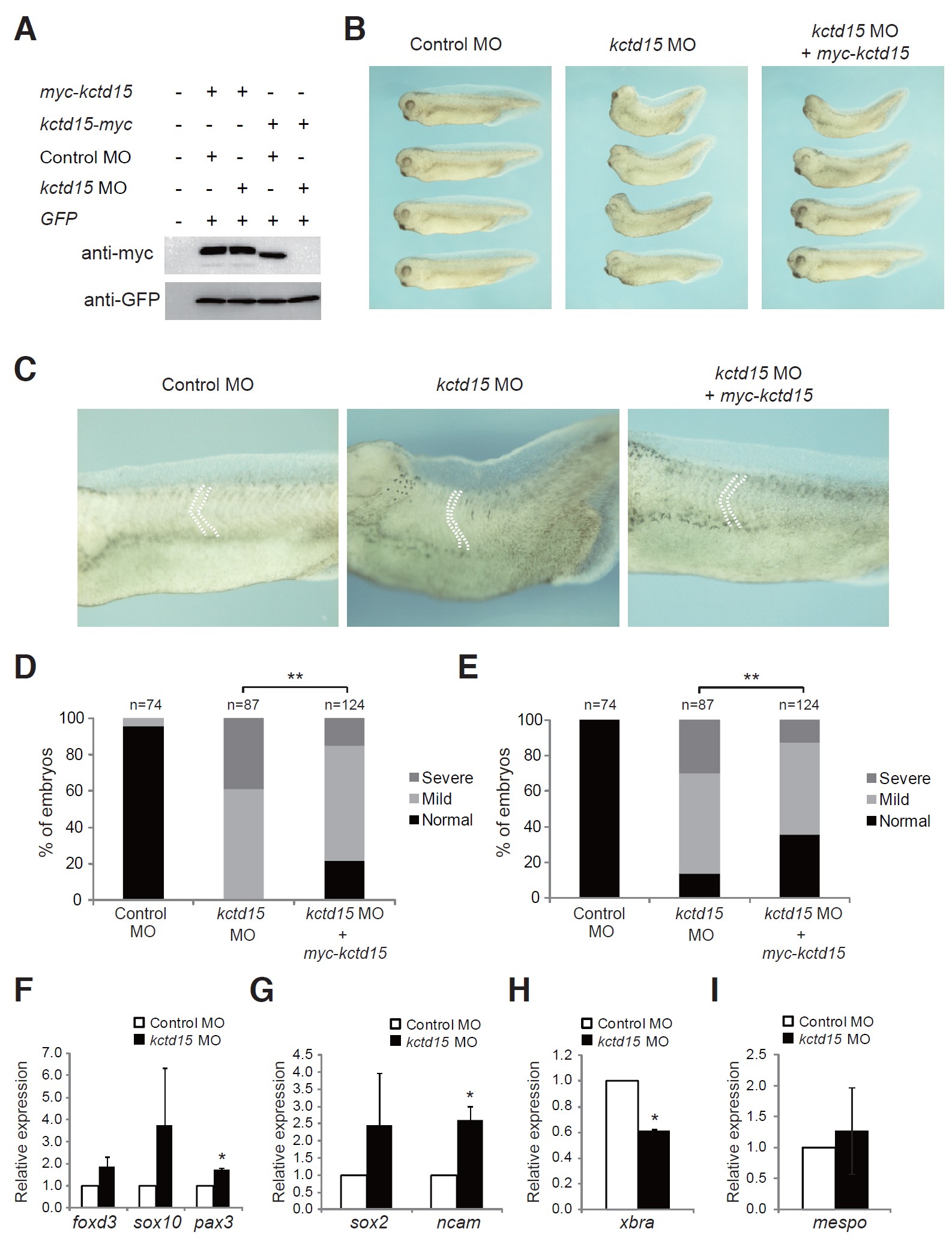 Fig. 4. Essential role of Xenopus kctd15 in dorsal development. (A) The specificity and efficiency of kctd15 MO. The combination of GFP mRNA (200 pg) plus control MO (80 ng) or kctd15 MO (80 ng) was co-injected with myc-kctd15 (800 pg) or kctd15-myc mRNA (800 pg) into Xenopus embryos. Injected embryos were harvested for immunoblotting at stage 10.5. (B,C) Control MO (80 ng) or kctd15 MO (80 ng) was injected into the animal pole of each dorsal blastomere at the four-cell stage. For rescue experiments, myc-kctd15 mRNA (800 pg) was coinjected with kctd15 MO (80 ng). At the late tailbud stage, injected embryos were photographed with anterior to the left and dorsal to the top. White dotted lines in C represent somite boundaries. (D) Obtained phenotypes were classified into three groups (severe, mild or normal) according to the extent of defects in head morphologies. **, P < 0.01. Fisher exact test was used to compare the frequency of normal head development between embryos injected with kctd15 MO alone and those injected with kctd15 MO plus myc-kctd15 mRNA. P = 6.5 x 10-8. (E) Obtained phenotypes were classified into three groups (severe, mild or normal) according to the extent of defects in somite morphologies. **, P < 0.01. Fisher exact test was used to compare the frequency of normal somite development between embryos injected with kctd15 MO alone and those injected with kctd15 MO plus myc-kctd15 mRNA. P = 0.00045. (F-I) Real-time quantitative RTCR analysis of marker gene expression. Embryos dorsally injected with control MO (80 ng) or kctd15 MO (80 ng) were cultured until stage 15 (F, G) or 19 (H, I). The relative expression levels of the indicated genes were normalized to that of odc. Shown is the average of two (F-H) or four (I) independent experiments. The error bar represents SD. *P < 0.05, **P < 0.01, unpaired t test. P values versus control were as follows: 0.11 for foxd3 expression, 0.27 for sox10 expression, 0.0046 for pax3 expression, 0.31 for sox2 expression, 0.029 for ncam expression, 0.00083 for xbra expression, and 0.47 for mespo expression. |
